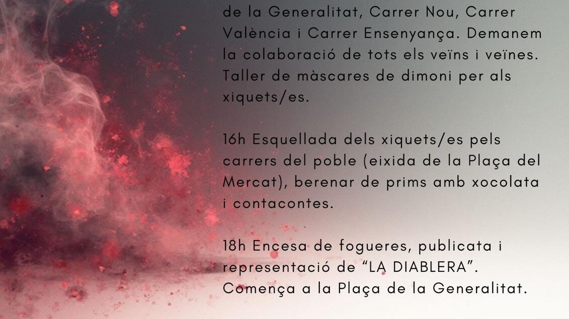 A mitja vesprada, els més menuts seran els protagonistes amb l’esquellada pels carrers del poble, amb eixida des de la plaça del Mercat, seguida d’un berenar de prims amb xocolata i una sessió de contacontes.