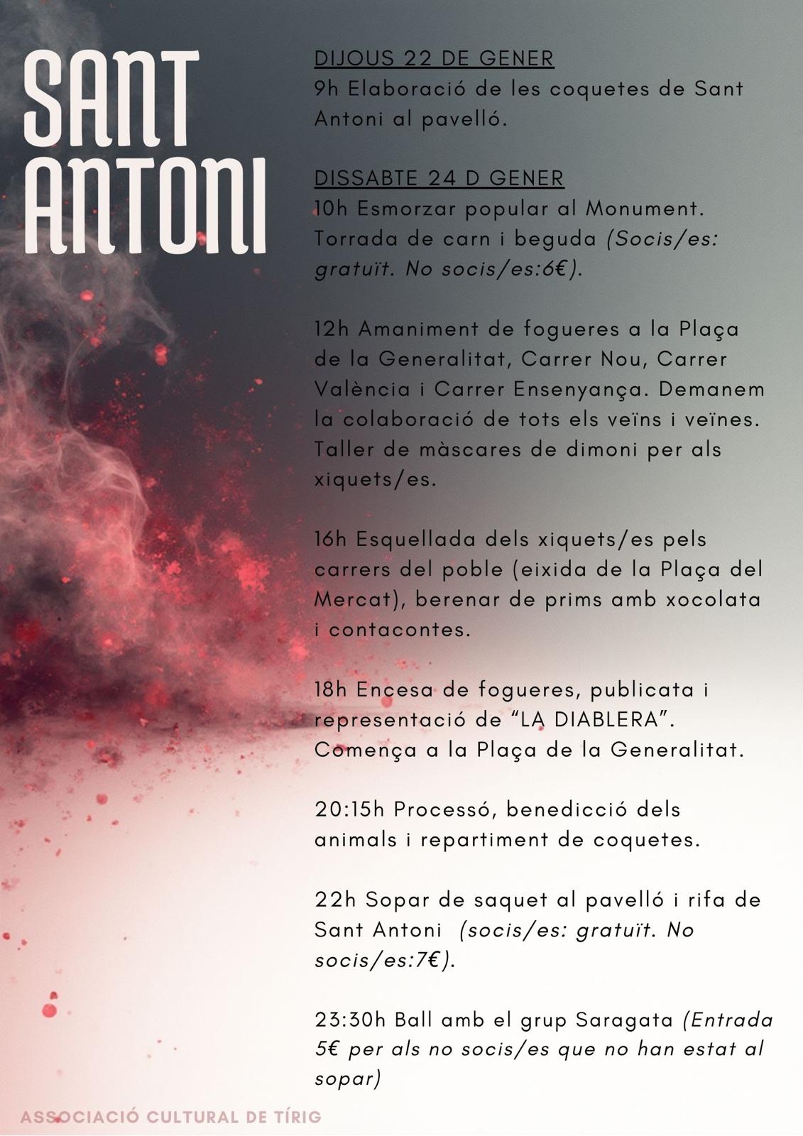 L’Associació Cultural de Tírig ha organitzat un complet programa d’actes per a celebrar la festivitat de Sant Antoni, que tindrà lloc els dies 22 i 24 de gener. Un conjunt de propostes que mostren la devoció que té el poble per Sant Antoni i que inclouen nombroses activitats adreçades als veïns i veïnes més joves, amb l’objectiu d’assegurar la continuïtat de la festa.